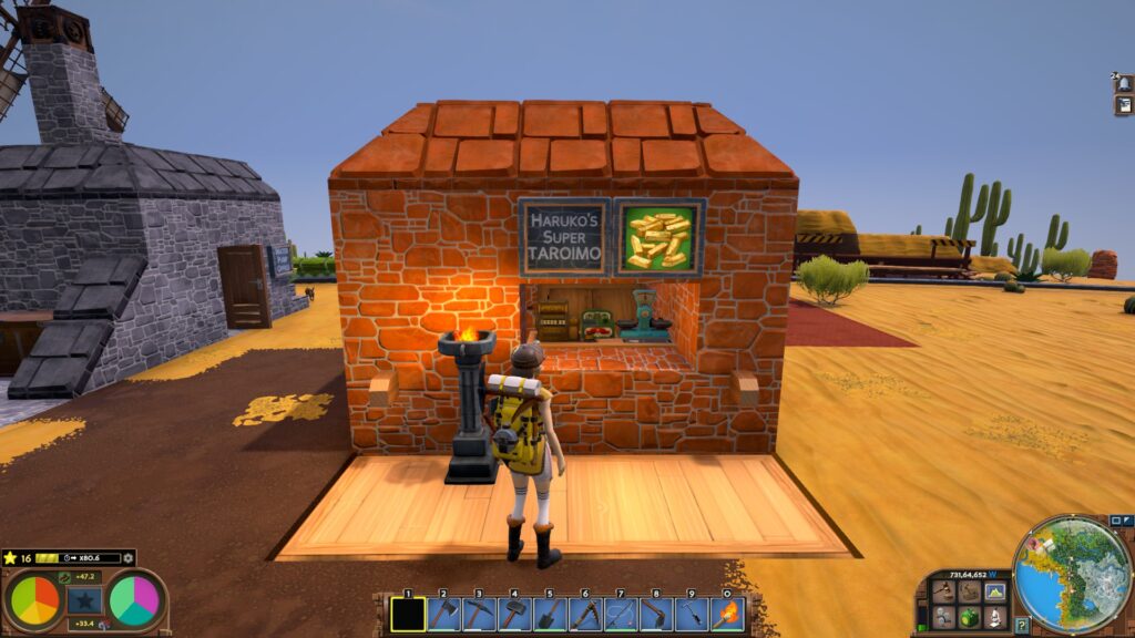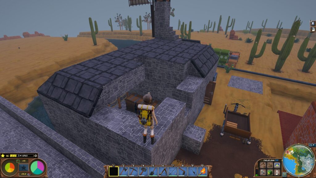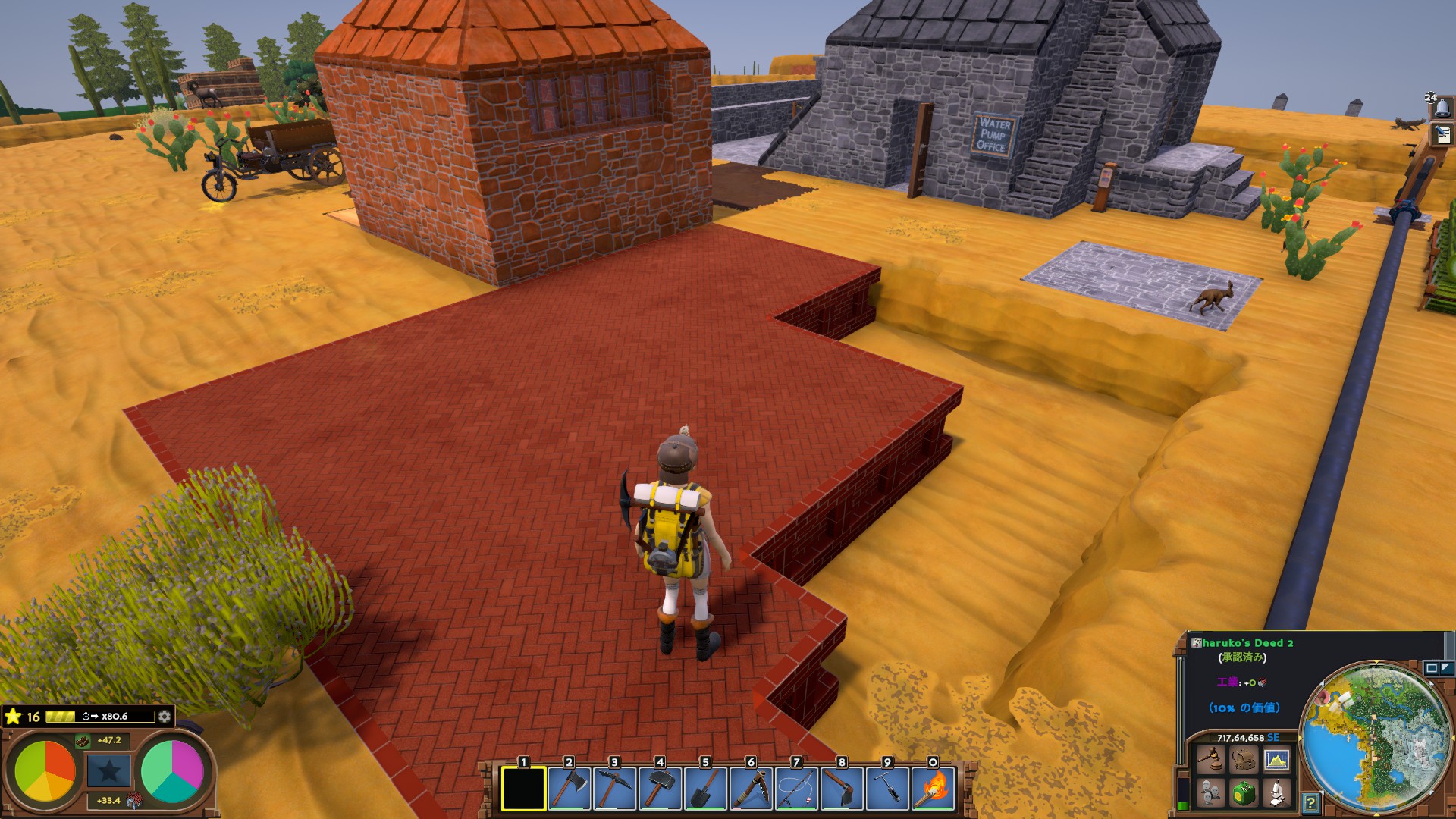 今住んでいる場所は、EVERTONという名の町になったのですが、開発する土地があまりなくなり、また環境保全のために、あまり地面を掘り返したりしたくなくなってきました。なので、資源が多く眠り、また開発する面積のある砂漠地方に、新しく拠点を作りつつあります。まあ、わたしが勝手に提案してるだけなんですが笑