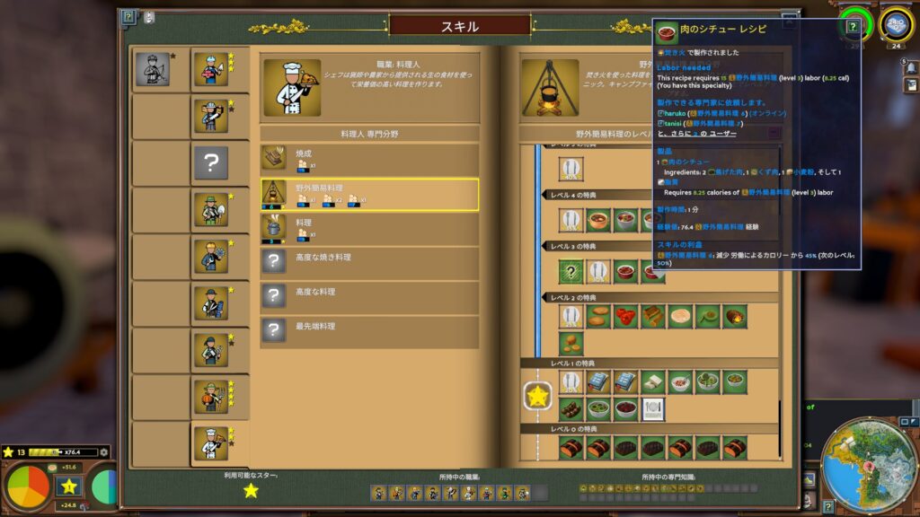 やたらと多い料理スキルと料理の種類。